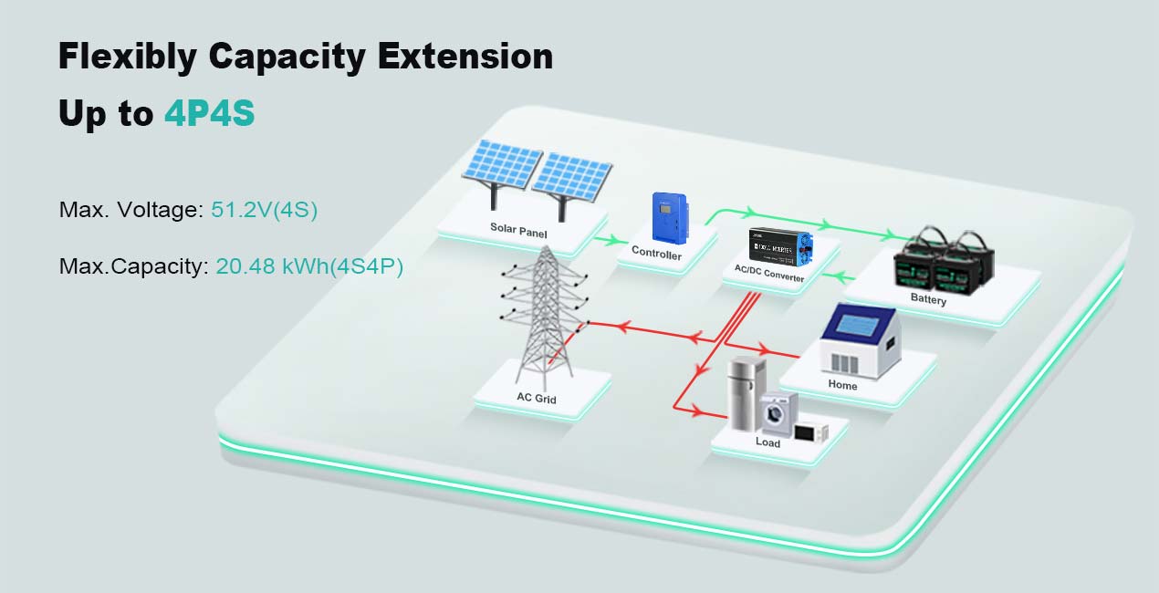 -- Maksymalne napięcie szeregowe do 51,2 V. Oznacza to, że bateria 12,8 V może być połączona w 4 ciągi, a bateria 25,6 V w 2 ciągi. Maksymalna liczba połączeń równoległych nie powinna przekraczać 4.