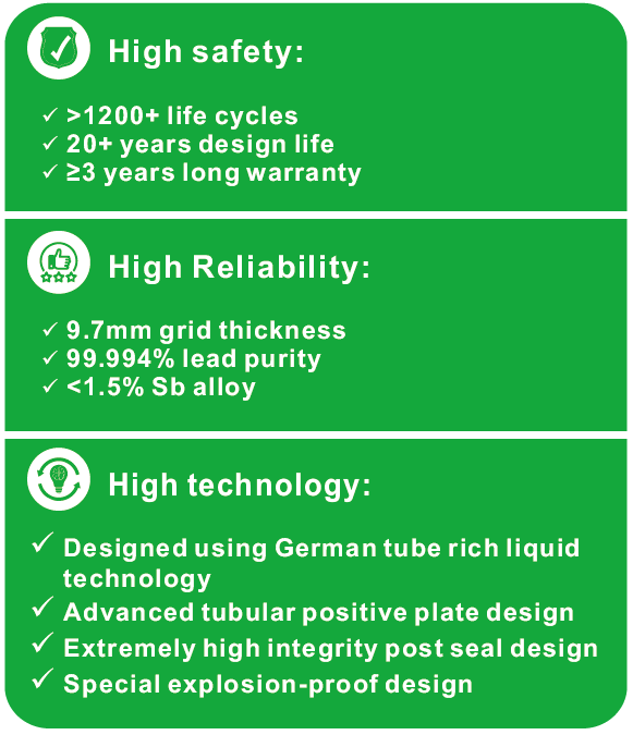 | Technologia | Akumulator kwasowo-ołowiowy rurowy + falownik + moduł fotowoltaiczny |