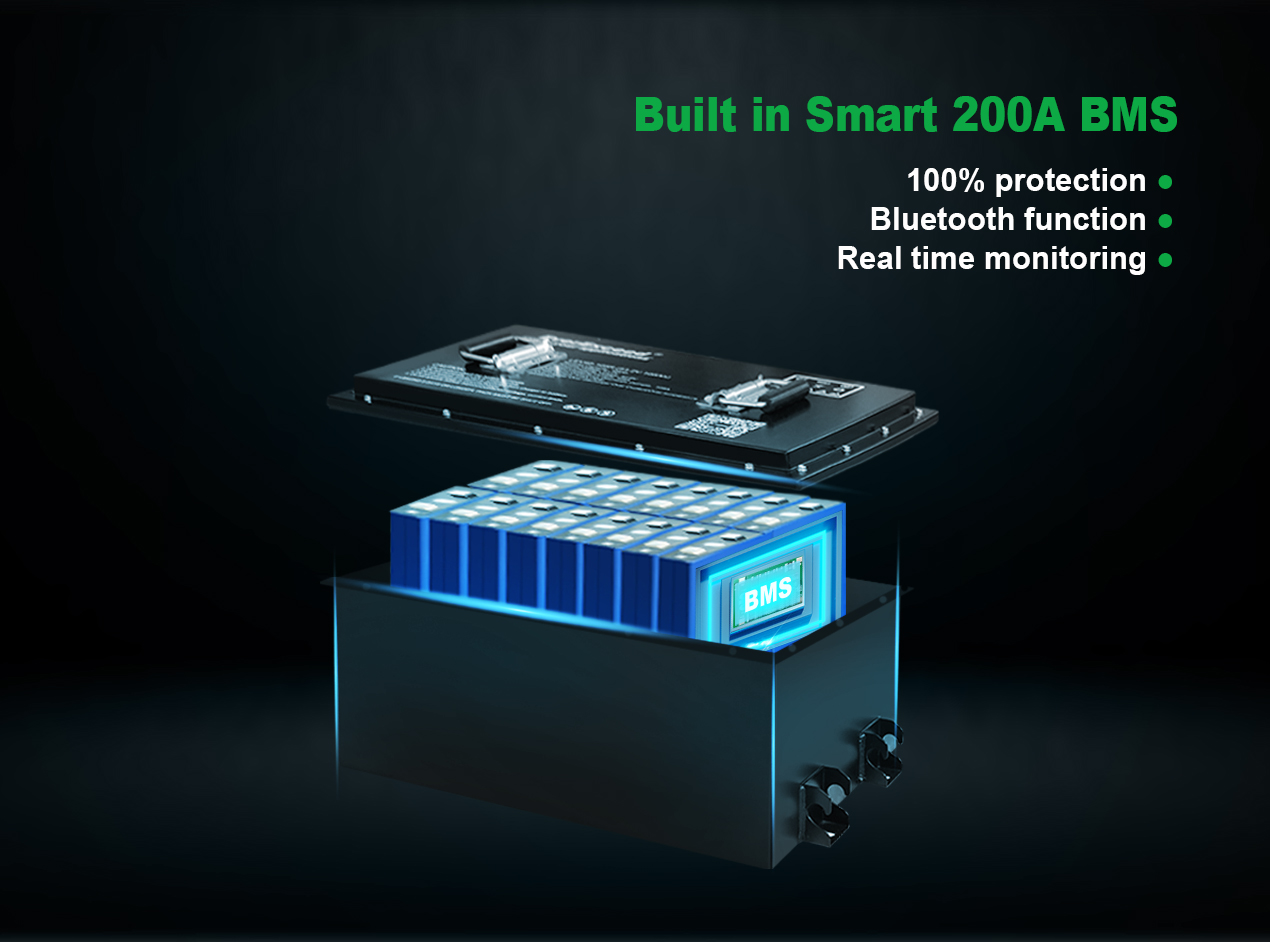 Wbudowany niezawodny Battery Management System (BMS) gwarantuje bezpieczną pracę przez cały okres eksploatacji. BMS jest zbudowany z doskonałą automatyczną ochroną przed przepięciem, przetężeniem, nadmiernym rozładowaniem i przegrzaniem.
