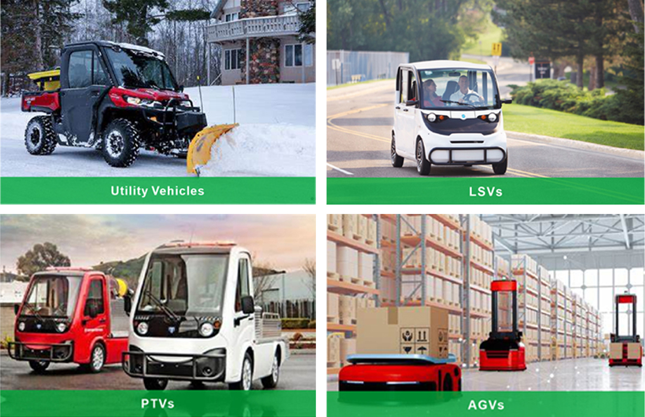 Wózki golfowe, pojazdy użytkowe, pojazdy wolnobieżne (LSV), pojazdy transportu osobistego (PTV), pojazdy sterowane automatycznie (AGV)