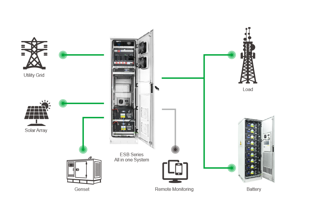 Nasze nowo opracowane systemy prostowników telekomunikacyjnych serii ESB zostały zaprojektowane w oparciu o koncepcję „zintegrowanego, wielofunkcyjnego systemu zasilania stacji bazowej”. System obejmuje moduł prostownika, moduł solarny MPPT, falownik, akumulator litowo-jonowy, moduł monitorujący, klimatyzator, jednostkę dystrybucji zasilania (PDU) oraz szafę stacji bazowej, tworząc w ten sposób kompleksowe rozwiązanie infrastrukturalne dla budowy stacji bazowych. Podobnie jak w tym projekcie, możemy dostosować wszystkie typy systemów prostowników telekomunikacyjnych serii ESB do wymagań klienta, zapewniając im większą elastyczność, niezawodność i przystępną cenę.