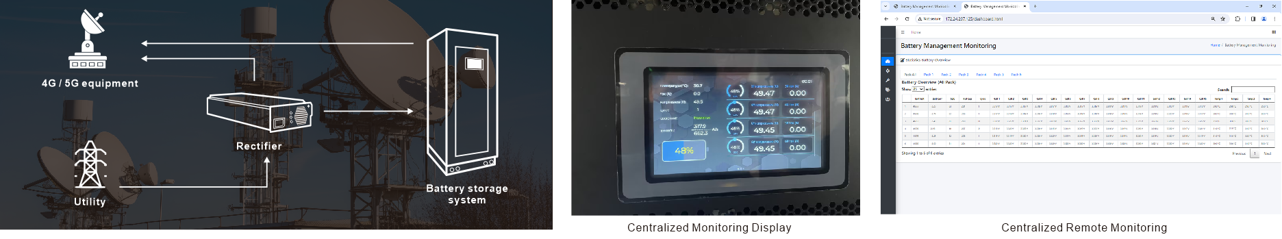 W tym projekcie dostarczyliśmy 6 modułów baterii litowych 48V600Ah (EV48600-T) połączonych równolegle, które mogą zapewnić zasilanie awaryjne przez 60 minut dla systemu 25 kW, gwarantując utrzymanie systemu komunikacyjnego bez konieczności wyłączania go w przypadku awarii głównego źródła zasilania, co pozwala uniknąć dużych strat ekonomicznych i zyskać czas na naprawę zasilania.