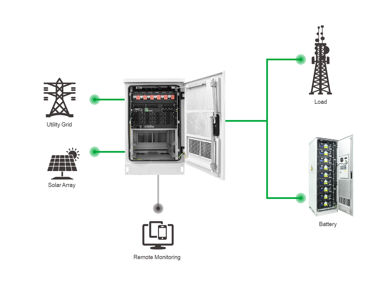 Wszystko w jednym projekcie: Szafa jest wysoce zintegrowana i obsługuje zasilanie z paneli fotowoltaicznych, prądu przemiennego i oleju napędowego. Użytkownicy mogą elastycznie wybierać źródło zasilania w zależności od rzeczywistych potrzeb, aby zoptymalizować efektywność energetyczną.