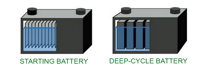 Akumulatory o głębokim cyklu są zaprojektowane tak, aby rozładowywały się do 80% za każdym razem i mają znacznie grubsze płyty. Główną różnicą między prawdziwym akumulatorem o głębokim cyklu a innymi jest to, że płytki są SOLIDNYMI ołowianymi płytami, a nie gąbką. Daje to mniejszą powierzchnię, a tym samym mniej „natychmiastowej” mocy, jakiej potrzebują akumulatory rozruchowe. Chociaż można je ładować do 20%, najlepszą metodą na żywotność i koszty jest utrzymanie średniego cyklu przy około 50% rozładowaniu.