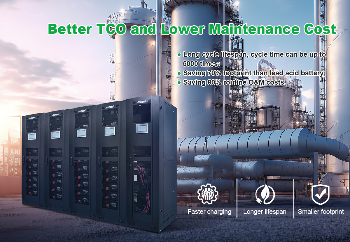 Osiągnij lepszy całkowity koszt posiadania dzięki nawet 5000 cykli, 70% oszczędności miejsca i 80% niższych kosztów konserwacji w porównaniu z akumulatorami kwasowo-ołowiowymi.