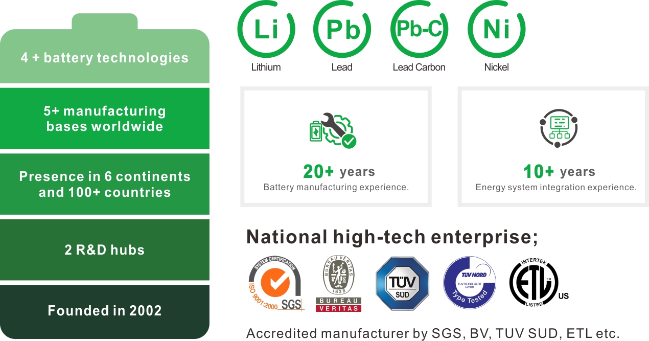 możemy zaoferować Bezpieczniej, mądrzej, prościej Systemy magazynowania energii w akumulatorach (akumulatory litowe/kwasowo-ołowiowe/niklowo-kadmowe) oraz systemy solarne. Posiadamy własną fabrykę z zaawansowanymi liniami produkcyjnymi, w której produkujemy akumulatory i montujemy kompleksowe systemy magazynowania energii do zastosowań domowych, komercyjnych i przemysłowych.