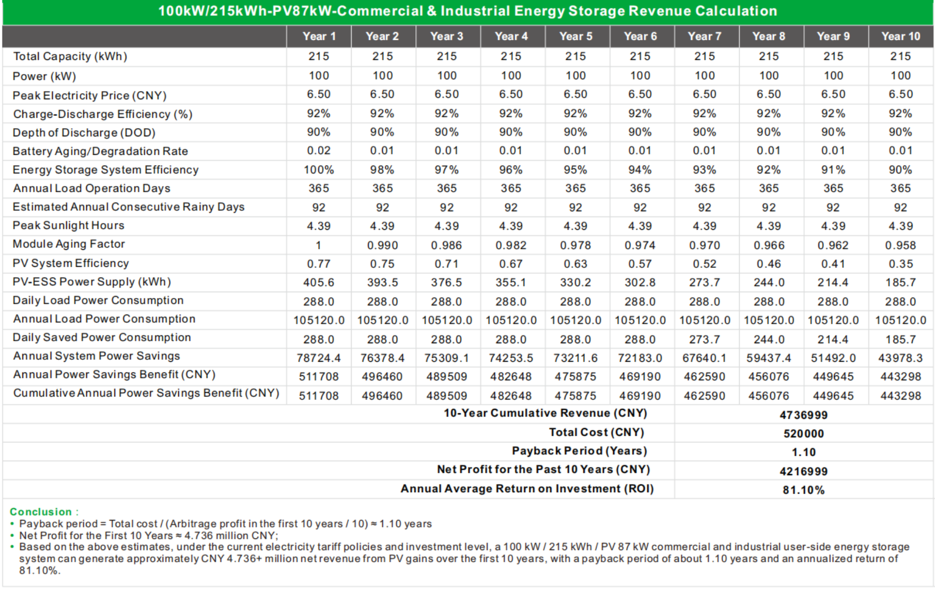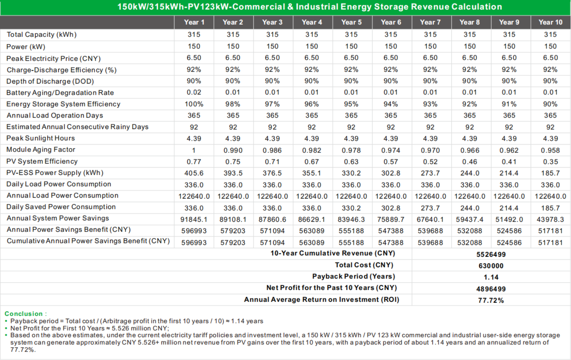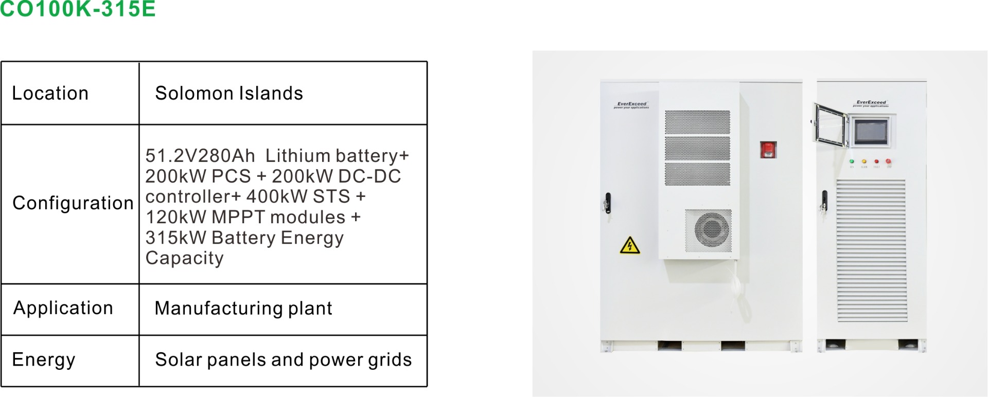 Przechowywanie baterii: Akumulator litowo-żelazowo-fosforanowy o pojemności 51,2 V i pojemności 280 Ah (22 akumulatory połączone szeregowo, 14,3 kWh na akumulator, całkowita pojemność 315 kWh), obsługujący ładowanie/rozładowywanie 0,5°C, z systemem BMS umożliwiającym monitorowanie w czasie rzeczywistym.