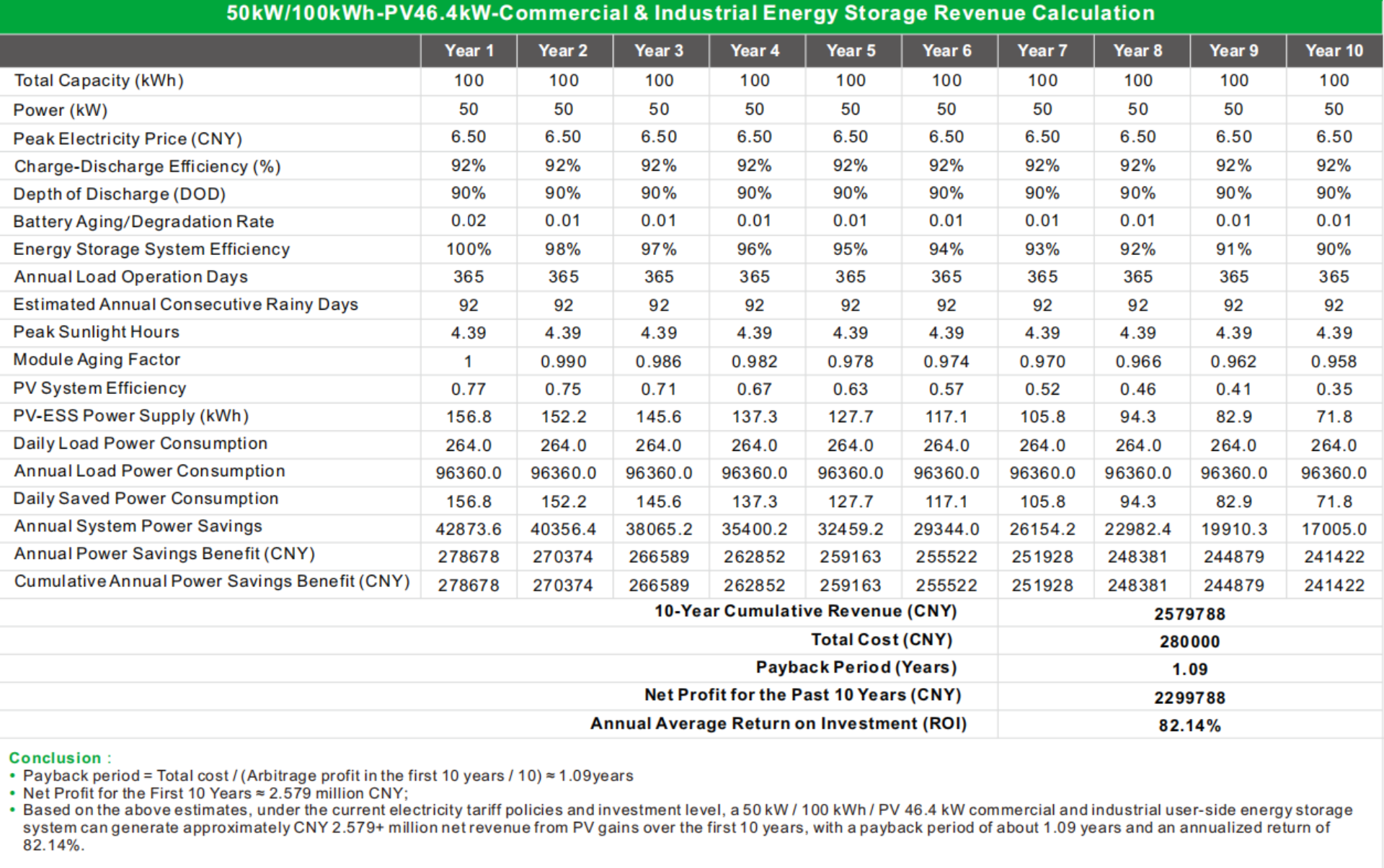 Przechowywanie baterii: Akumulator litowo-żelazowo-fosforanowy 51,2 V/280 Ah (7 pakietów połączonych szeregowo, 14,3 kWh na pakiet, całkowita pojemność 100 kWh), obsługujący ładowanie/rozładowywanie 0,5°C, z systemem BMS umożliwiającym monitorowanie w czasie rzeczywistym.