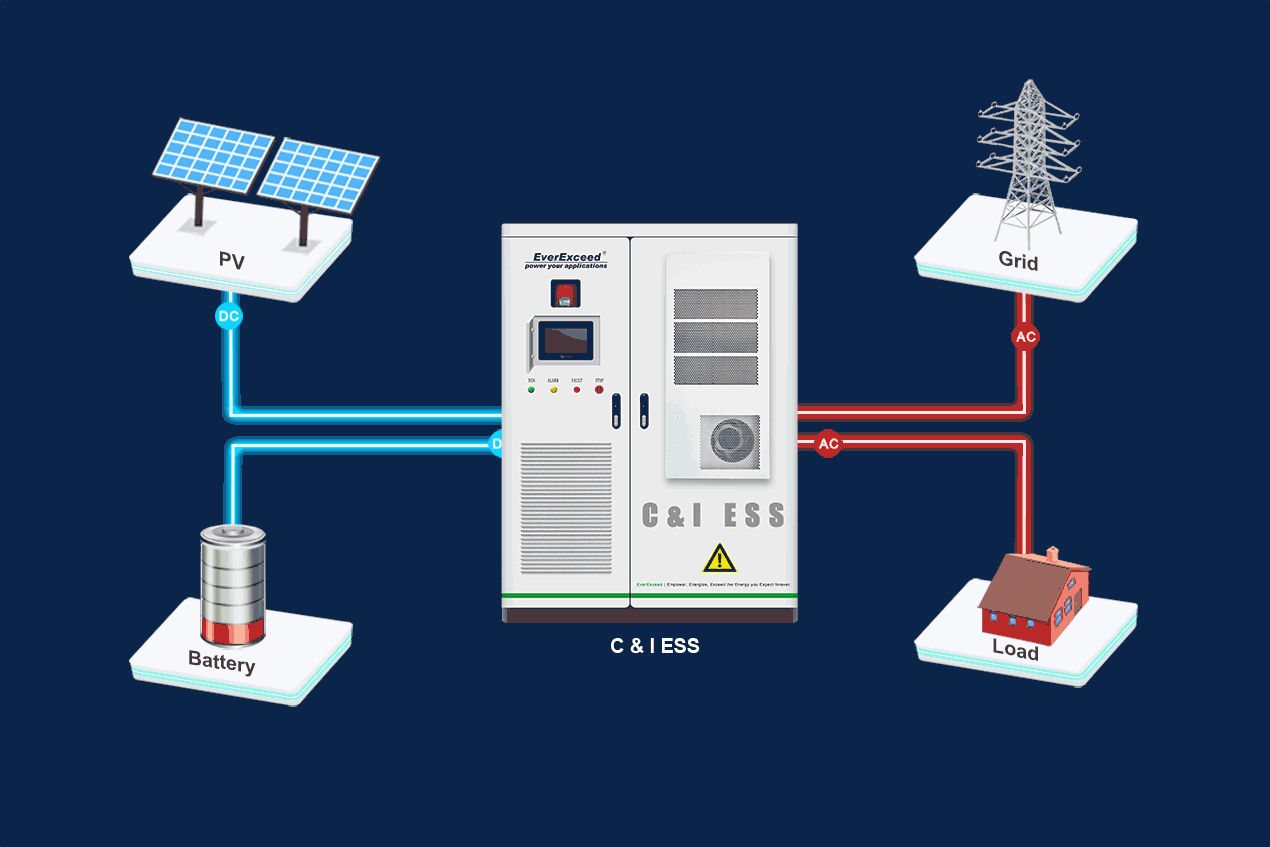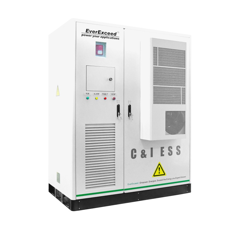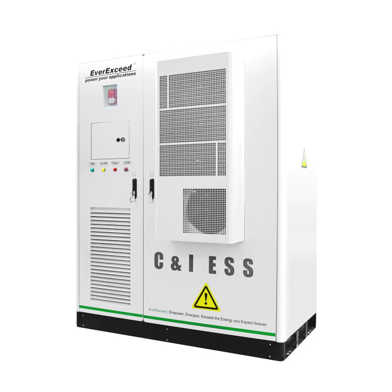 System EverExceed All-in-one EverPower Industrial & Commercial ESS w pełni integruje systemy PCS, akumulatory LiFePO4, BMS, PCS, EMS, system przeciwpożarowy i system odprowadzania ciepła w szafie. To wydajne rozwiązanie zasilania awaryjnego, przeznaczone dla klientów komercyjnych/przemysłowych na poziomie sieci. Ten wysokonapięciowy system magazynowania energii zapewnia najwyższą elastyczność zarówno w przypadku konstrukcji montowanych w szafach, jak i w szafach. System ten jest znacznie „bezpieczniejszy, inteligentniejszy i prostszy” i nadaje się do rozwiązywania problemów z zasilaniem w podstacjach, na terenach zewnętrznych, w mikrosieciach i magazynach energii, w małych fabrykach, centrach handlowych, stacjach ładowania akumulatorów słonecznych itp.