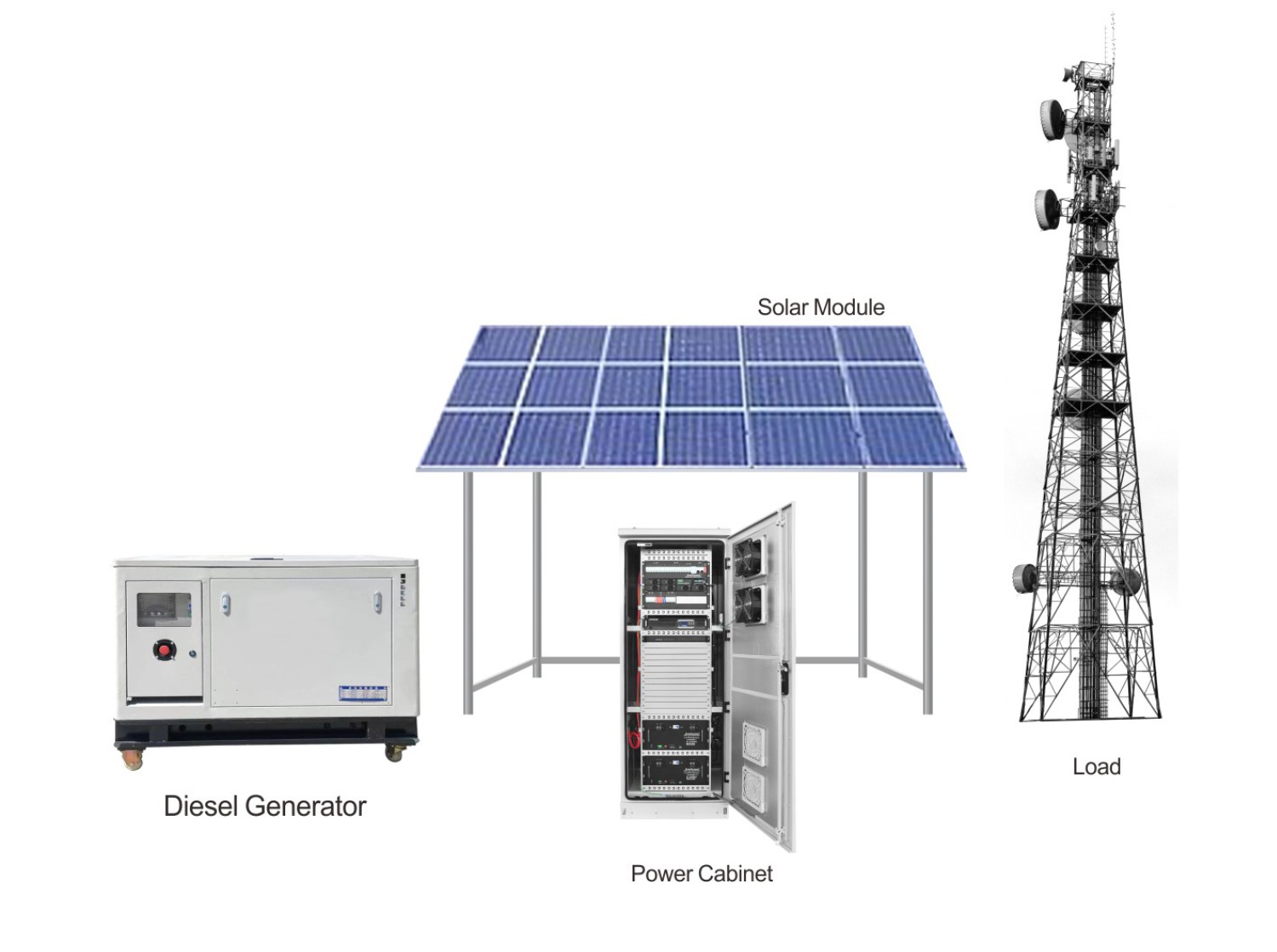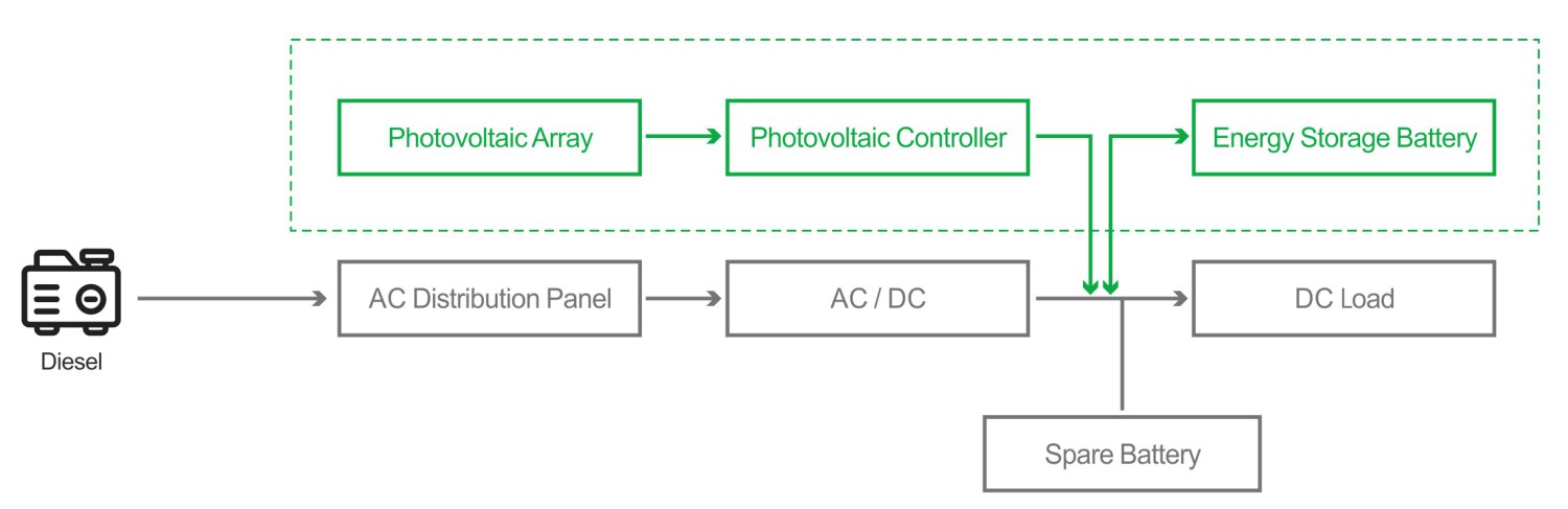 Ta hybrydowa architektura (fotowoltaika + akumulator + olej napędowy) zapewnia czyste, stabilne i ekonomiczne zasilanie stacji bazowej.