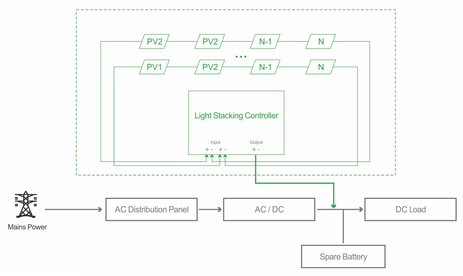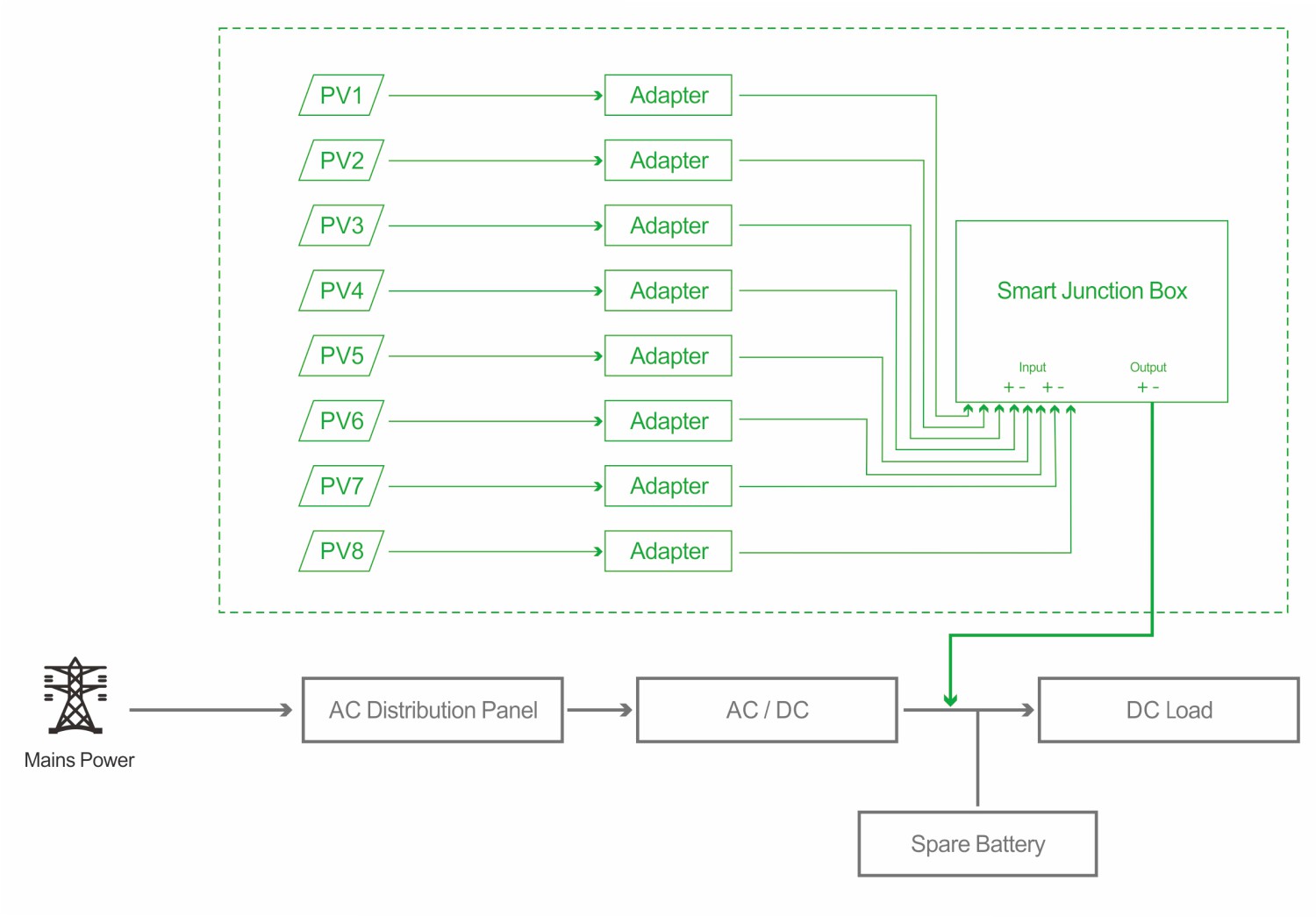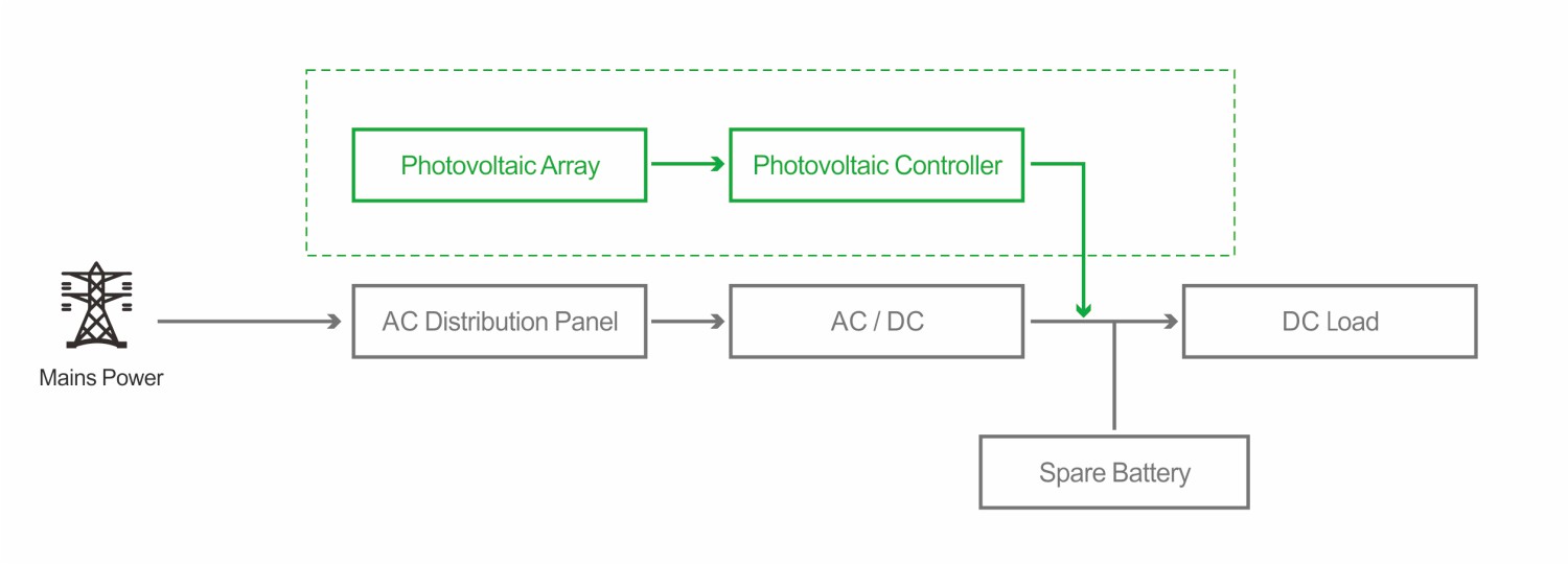 Rozwiązanie PV-Overlay integruje dodatkowy system fotowoltaiczny z istniejącą architekturą zasilania stacji bazowej telekomunikacyjnej, umożliwiając hybrydowe zasilanie energią „PV + sieć energetyczna”.