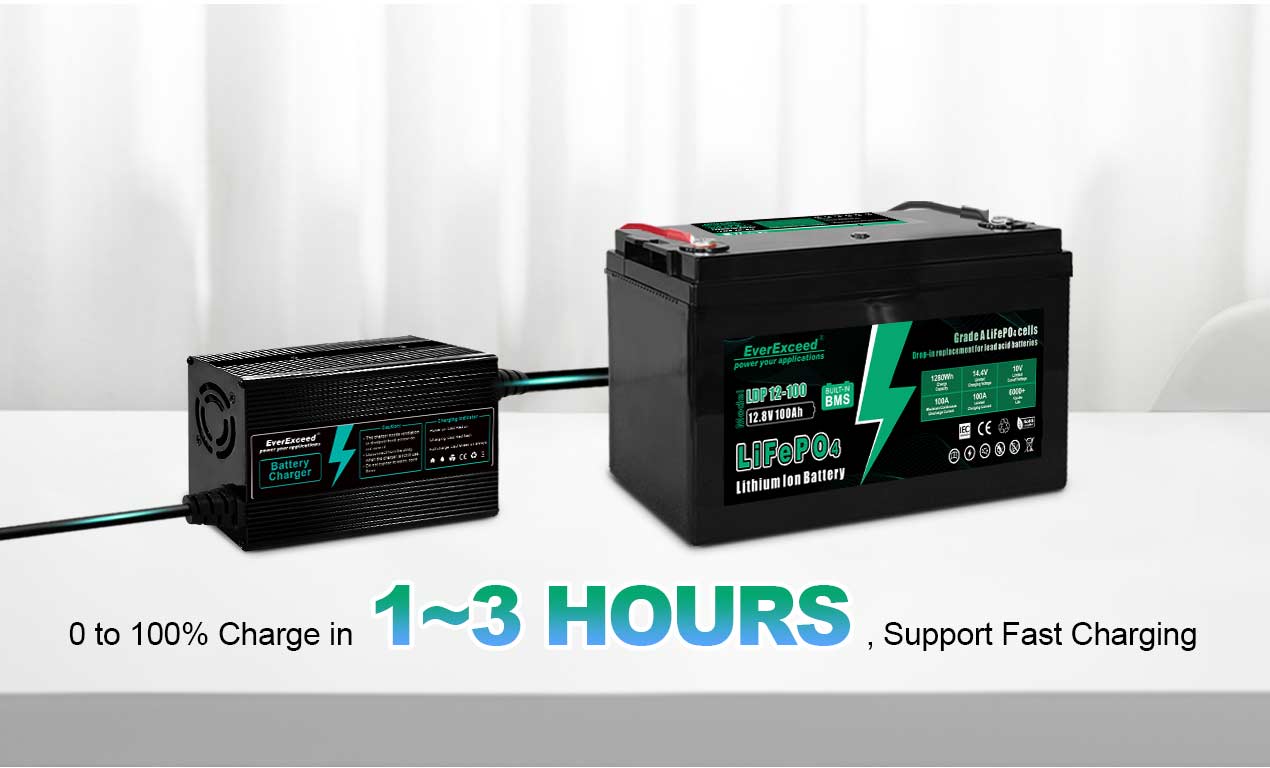 Akumulatory litowo-żelazowo-fosforanowe EverExceed można łatwo i w pełni naładować w bardzo krótkim czasie dzięki akceptacji dużego natężenia ładowania. Są one w stanie zaakceptować ciągły prąd ładowania o natężeniu do 1C (1 x znamionowa pojemność), dzięki czemu akumulator można w pełni naładować w ciągu 1–3 godzin. Ta cecha znacznie poprawia wydajność ładowania.