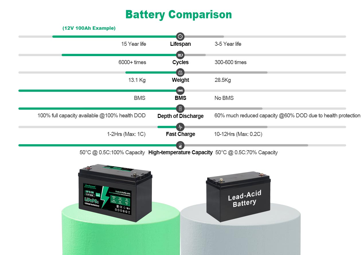 Akumulatory litowo-żelazowo-fosforanowe (LiFePO4) serii EverExceed LDP zostały opracowane z myślą o zapewnieniu wysokiej wydajności energetycznej w porównaniu z równoważnymi akumulatorami kwasowo-ołowiowymi. Mogą one przyjmować ciągłe, wysokie natężenie prądu ładowania, co pozwala na pełne naładowanie akumulatora w krótkim czasie i znacząco poprawia wydajność obciążenia. Wbudowany, zaawansowany układ B MS zapewnia inteligentną automatyczną ochronę przed przepięciem, przetężeniem, nadmiernym rozładowaniem i przegrzaniem.