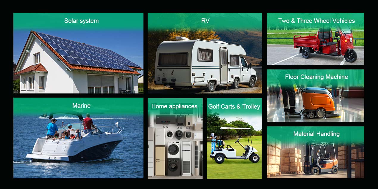 Wheel chair, sweeper, electric vehicle,robot , Solar/wind energy storage system, UPS Backup power, Telecommunication , Medical equipment , Solar street light, Toys